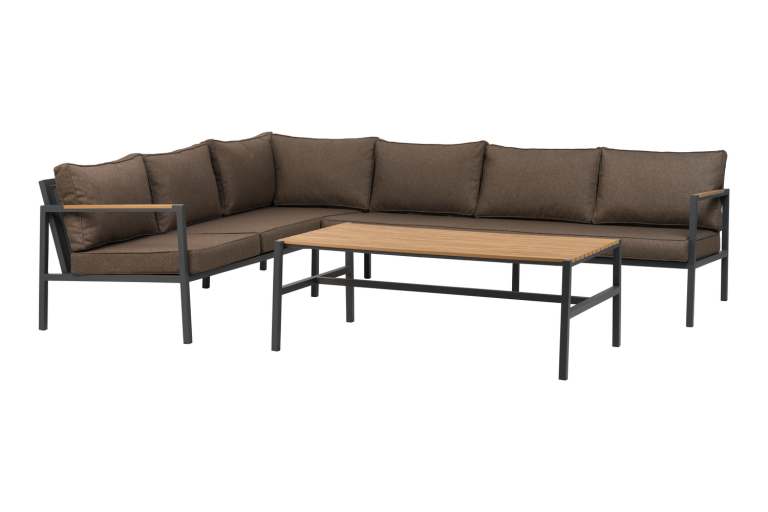CAP Hörnsoffgrupp i antracit med matchande mörkbruna dynor är en stilren och komplett loungegrupp. Lagervara, priset gäller så långt lagret räcker.