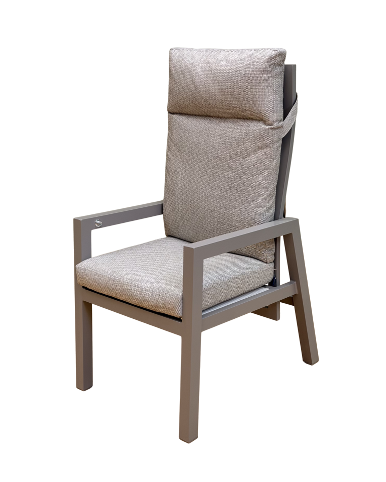 Positionsstolen är tillverkad i aluminium med steglöst reglerbar rygg. Den tjocka allvädersdynan i färgen greige ingår.