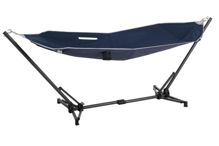 Portabel ställning gör att du kan placera hängmattan på den för tillfället perfekta platsen. Praktiska fack för bok och dryck. Inklusive bärbag.
