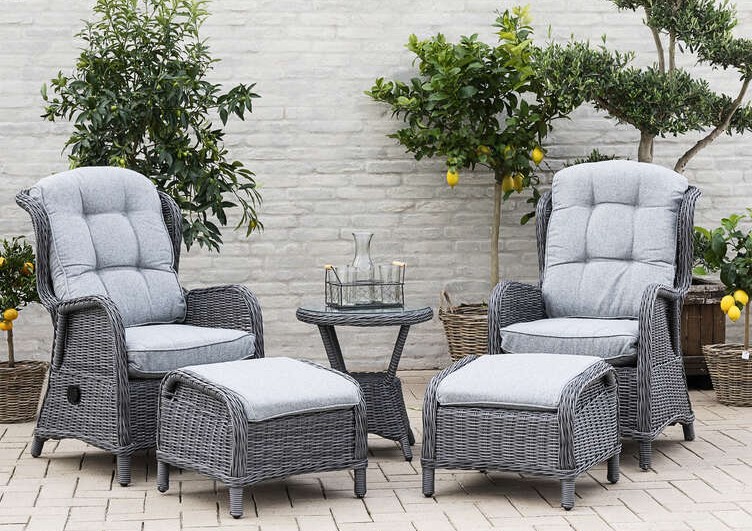 I gruppen ingår 2 st ställbara fåtöljer inkl. dynor, 1 st soffa inkl. dynor och 1 st bord.