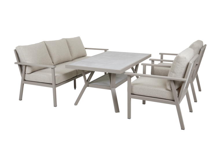 CAP Hörnsoffgrupp i ljusgrått med matchande grå dynor är en stilren och komplett loungegrupp.
